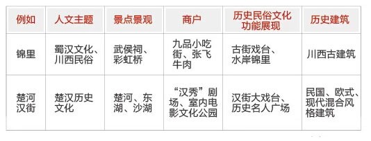 通過依托知名的人文景點景觀、恢復或者重現當地歷史民俗相關的商業品牌、歷史民俗文化功能展示、獨特的仿古建筑空間四個方面實現主題特色。